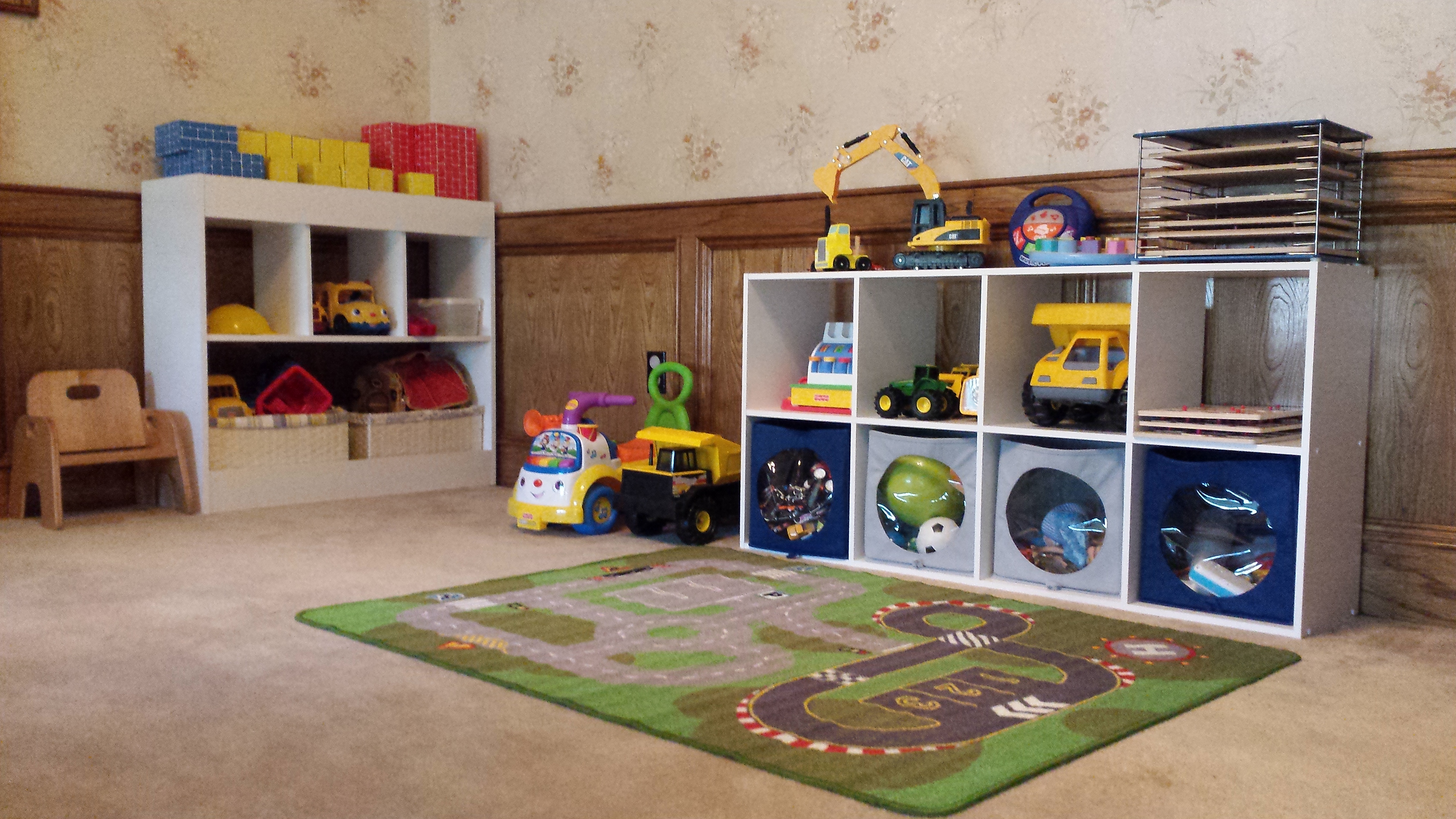 I forgot to take before pictures, but all parents can bring to mind a space where toys and all of the pieces are scattered throughout the room and mixed together as though it had rained toys! 🙂 The purpose of this project was to clear this large bonus room of outgrown toys and change it from a cluttered and overwhelming storage area to a functional play space the family can enjoy together. Two boys who are about to turn 3 and 7 live in this home. Along the first wall we placed the stuffed animal bin and the farms and little people sets. Between this space and the next picture is a linen type close that stores all of the board games and puzzles.