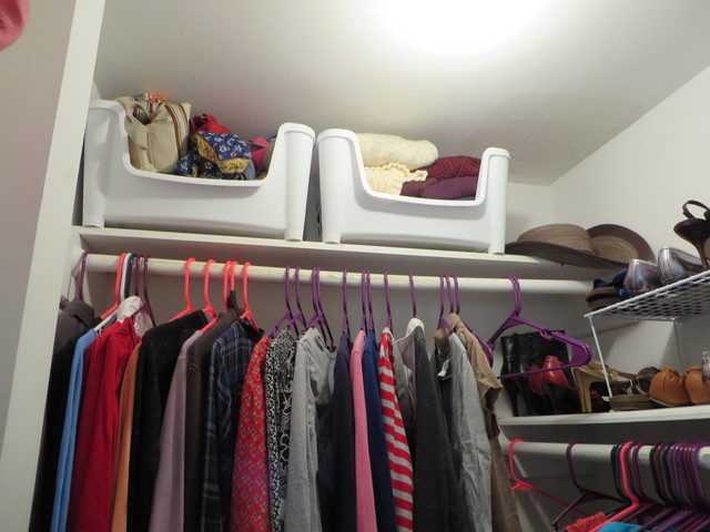 This young family moved into their first home and designated the dining room as a playroom for their toddler son. But after a few months that included a birthday and Christmas, the room began to feel like it was bordered with toys on the floor all around the room. To maximize the space, and to make room for a baby sister coming soon, we sorted, categorized and organized the space. Affordable shelving systems were purchased from Target, making it possible for alike items to be grouped in containers. The first picture shows the “building corner”. Blocks, duplos, and other car and building sets are stored here. Follow along the wall and there are more trucks, and a basket of small toys all ready for the play rug. This two year old already knows the balls go in one tote together, and there is another one for small figurines, and the last one has the “cell phones”, keys and other noisemaker toys. The puzzles are on the corner and can be played with on the floor or at the table in the corner. The table has handy access to the kitchen for future art activities that may need a quick trip to the sink! On the other side of the door to the kitchen is the dramatic play corner, where the kids can shop and cook up some great meals for their basket of stuffed toys! The flip out sofa bed from IKEA is flanked by two windows where parents can relax and enjoy snuggles with the kiddos. Tucked on the other side of the sofa is the baby corner — ready to be enjoyed as the new member of the family joins the fun. Even the baby toys have a container of rattlers and teethers, musical toys and soft toys. Next step? Strip the walls of the 80’s dining room wallpaper and get creative with the walls. What is your vote? Paint the paneling or leave it wood? Colors for the walls? Alphabet frieze? Chalkboard magnetic paint anywhere? Let’s hear your ideas! The great thing is the room has already been kid tested – played in and cleaned up quickly because every item has a home!