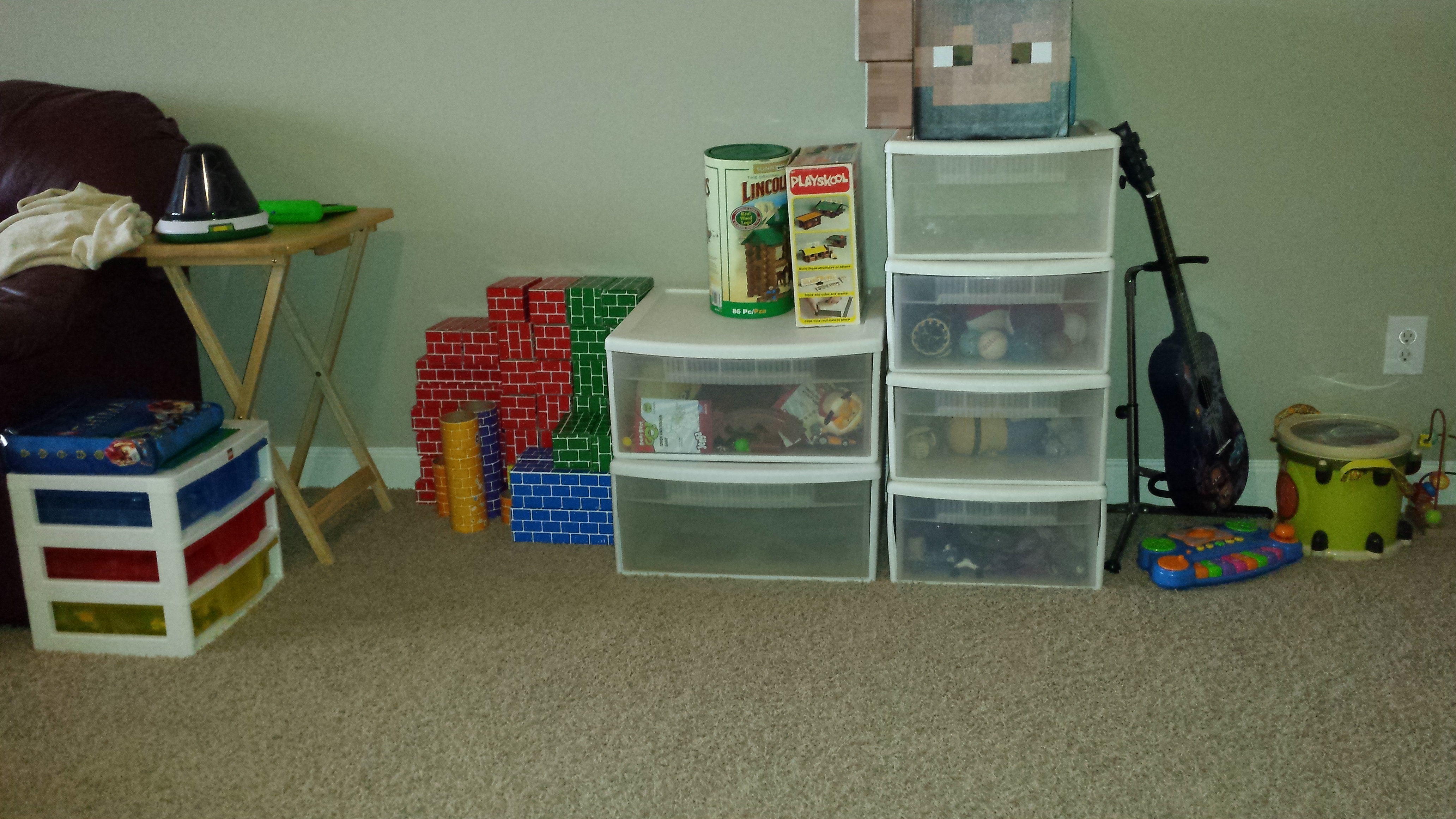The “building area” is next to the couch so the boys can build on the floor space or take advantage of the flat surface of the large coffee table in front of the couch when they need a hard surface as a base. The last set of drawers hold some collections like angry bird toys and those hosts of figurines that find their way into all play spaces. They are even enjoying the luxury of a couple of empty drawers for future use. Lastly, their creative music toys are stored together. This family has strategically chosen to store books in the bedrooms for easy access for resting and reading. They also have a well stocked “art center on wheels” that is tucked away downstairs and brought out for craft times at the breakfast table near the kitchen sink. This project was all about creating function out of a space that had previously been used to store toys more than it had been used to play with toys. We were successful at creating function and flow while taking advantage of resources already owned by the family. Now they can experience this area of their home in a new and purposeful way while considering options for design choices that may include vertical storage as well as a corner for an “adult work station”. The possibilities are endless but the function has already begun.